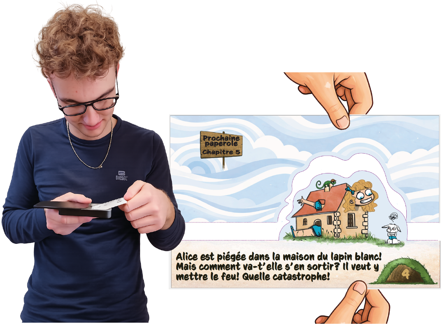 À la fin du premier chapitre, pioche la première paperole. Détache la partie inférieure : une illustration d’un personnage ou d’un évènement te donnent un indice pour savoir où la coller.